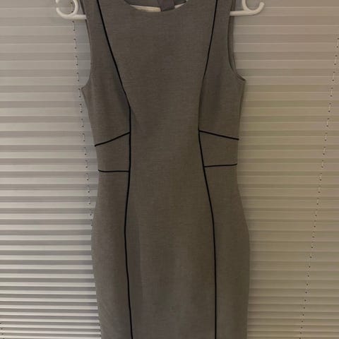 Ubrukt grå kjole med svarte detaljer og noe tettsittende passform. Åpnes/lukkes med en skjult glidelås på ryggen.