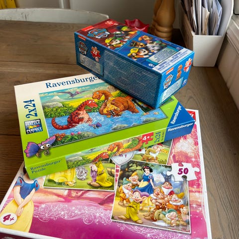 Pent brukte puslespill er til salgs. Ingen brikke mangler.