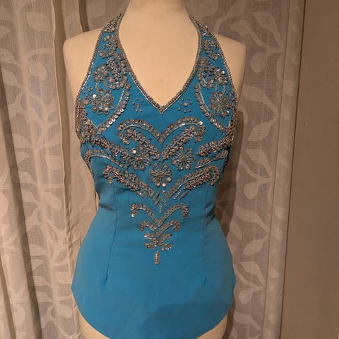 Svart og blå topp med perler og paljetter. Toppen er i 100 % silke og er håndsydd, se bilde av baksiden for å se det fantastiske håndarbeidet som ligger bak..