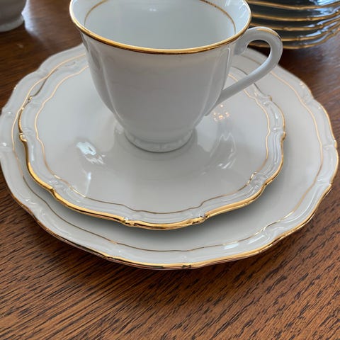 Søtt kaffe porselen service med gulldekor fra Porsgrund selges. Sett med 4 kopper, underskåler og fat. Uten skår og sprekker. Serviset er fra 1960-tallet. Kan sendes.