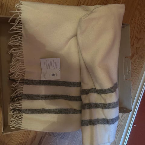 Ullpledd fra Sir John med håndsydd kant av norsk pelssau.