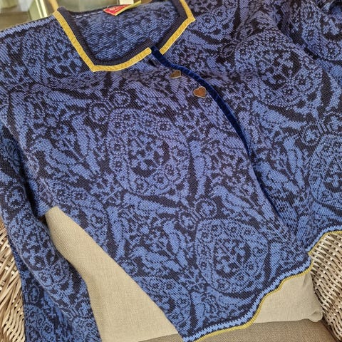 Brystmål under det ene ermet til neste erme er 54 cm. Lengden er 56 cm.
