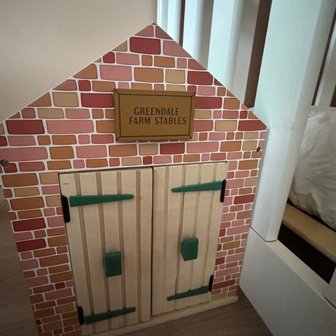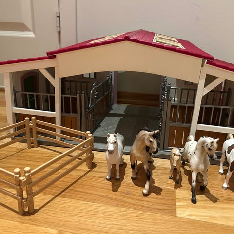 Pony stall i tre med 2 Pony selges. Taket kan fjernes og porten åpnes. Det følger med 2 par vinger og 2 hårklemmer.