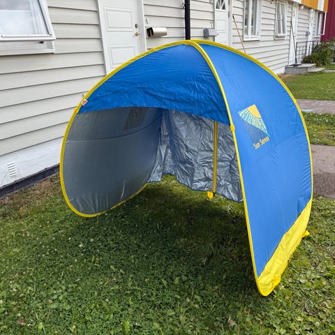 Solsengtrekket har flere lommer som man kan oppbevare småsaker i på stranden.