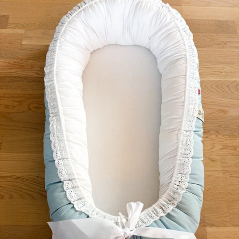 Nydelig babynest i støvet lysrosa på utsiden og på innsiden, hvit silkesløyfe og skråbånd foran. Noe falmet