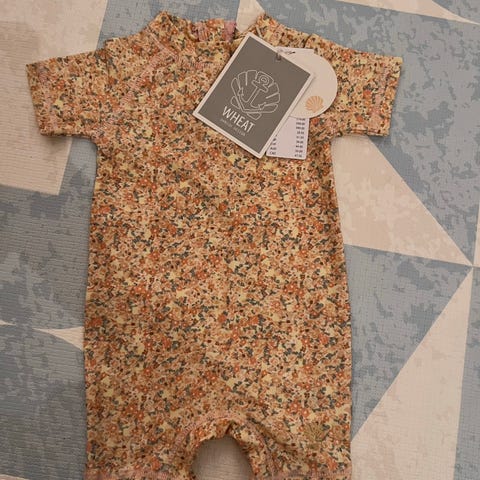 Soldrakt / badedrakt / UV drakt SPF 50+ fra danske Wheat. Marineblå og hvite striper. Str 62, ca 3 måneder.