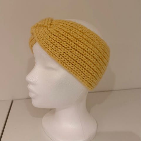 Godt, varmt og behagelig pannebånd til vinteren i nydelig sennepsgul. Pannebåndet er hjemmestrikket med garn som består av 60% ull, 20% acryl og 20% nylon
