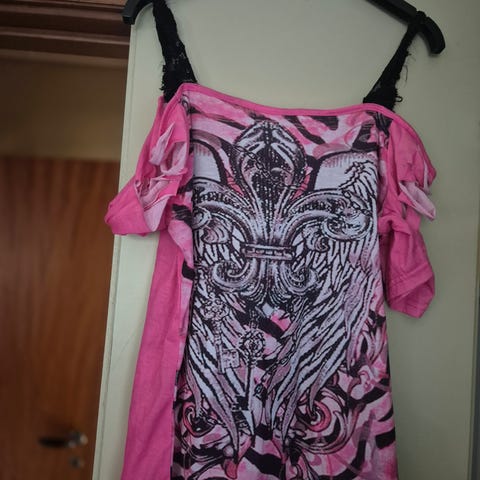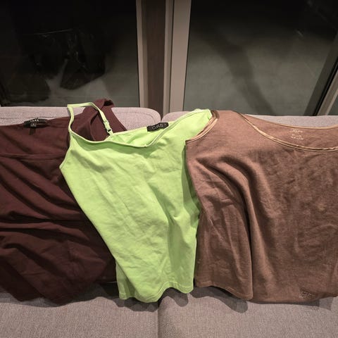 Toppene er I fargene grønn (Tara XL), rosa (Tara XL) og lys blå (L, litt vid fasong).