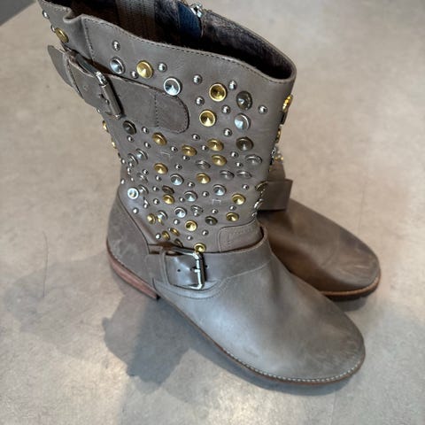 Nye, tøffe støvletter med godt for, str 37, mykt, godt skinn, "nagler," som pynt, glidelås på siden helt ned. Selges for 315 kr.