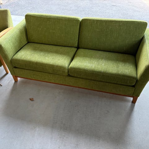 Gul sofa selges. Sofaen har stått i en loftstue som ikke har vært i bruk, og har derfor i praksis kun fungert som pynt.