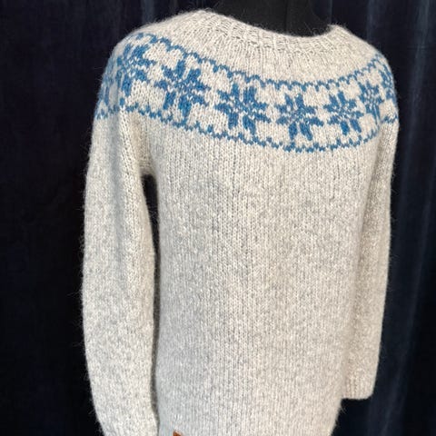 Nydelig Fanagenser med hette strikket i Fritidsgarn 100% ull . Kardegarn er 100 % norsk garn. Strikket i str mellom S og M og er for liten for meg som til vanlig bruker Medium.