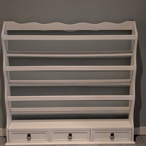 Hvit trehylle med utskjæringer