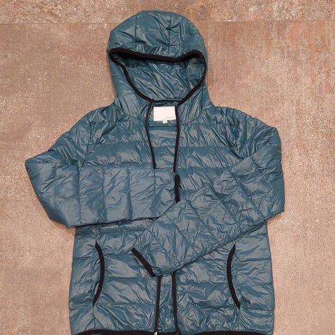 Hvit, lett dunjakke fra florence design. Ubrukt, men prislappen er fjernet. Str m. 90 % dun. 10 % fjær.