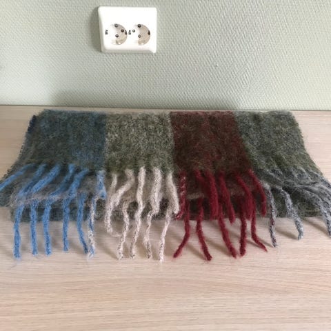 Tøft ullskjerf i flotte farger, måler 17*135cm, made in Scotland. Ubrukt. Hentes på Torshov. Heis. Buss 20 og 30 stopper rett utenfor.