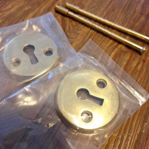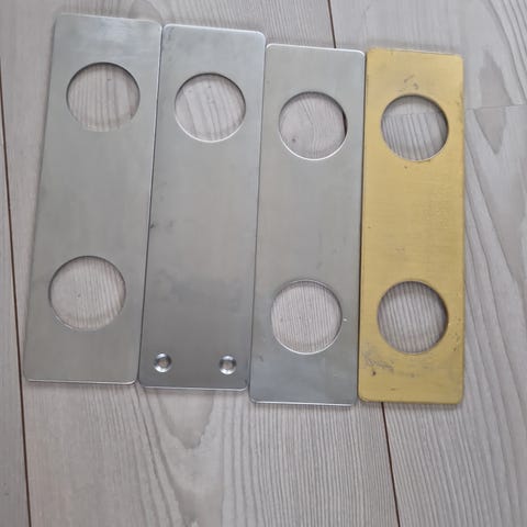 Utvendig og innvendig skilt til sylinderlås / dråpeformet sylinder. Med skruer. Kr 150 pr par.