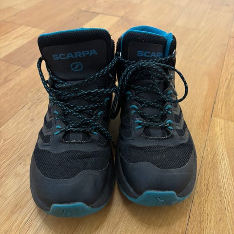 Dessverre for små, men vi oppdaget dette for seint. Kjøpte de i høstferien for to år siden og skulle bruke de et halvt år etterpå. Nye koster de 1499 kr. Vi selger de for 450 kr og de er fullstendig ubrukte. De er impregnert allerede. De er utrolig lette og kan brukes som vintersko med en varm sokk og evt ullsåle. De er vanntette og halvhøye rundt ankelen. God såle med godt grep som ikke sklir. Scarpa er et godt merke innen tur sko og tur utstyr.