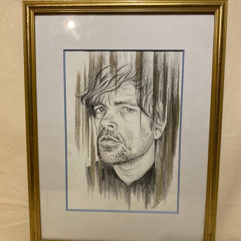 Må hentes på Grünerløkka. Per Palle Storm (1910-1994) Selvportrett i ramme 1964. BKH. Kullstift 26x40 cm. Monogramsignert n.t.h..