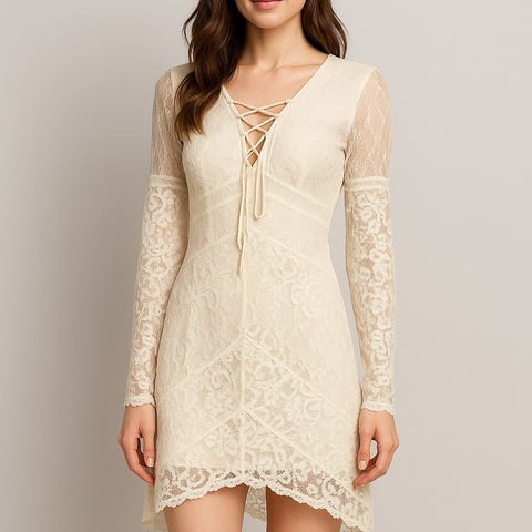 Festkjole i beige farge, størrelse S, designet for kvinner. Kjolen har langermet design med høy hals og en tettsittende passform med rynkedetaljer på sidene.