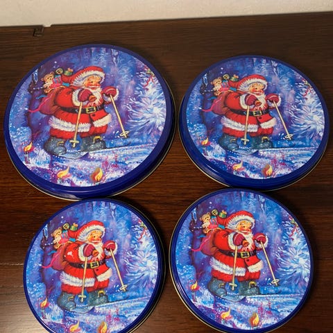 6 meget flotte runde BRIKKER/UNDERLAG, de er 9 cm i diameter. De ligger i en metallboks med lokk. Høyden på esken/boksen er 3,5 cm, diameter er 9,5 cm, veier 160 gram. Metall boksen og brikkene/underlagene er meget fine, ser ut som nytt! Motivet er nisse/julemotiv. Samme motiv på lokket. Under brikken er det kork. Brikkene er 3 mm høye. Fargen på metall boken er mørk/dyp rød. Metallboksen med underlagene/brikkene kan sendes, eller hentes her i Sandefjord, eller avtale henting i Tønsberg på Tolvsrød.