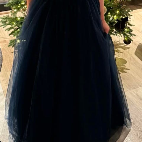 Kjolen har masse perle broderier i blanke skinnende perler, flott silkelignende stoff, og med lagvis tyll i skjørtet.