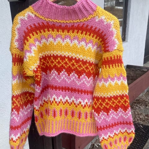 Råtøff og fersk fra pinnen! Strikket i to typer garn. Denne er fra boka klompelompe og heter Brita-genser. Denne genseren er vid og kort. Jeg har en selv og er kjempe fornøyd med den, har brukt den masse. Garnet holder seg fint.