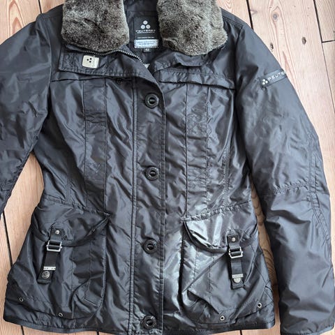 Dunjakke fra Milestone med avtagbar pelskrage. Pen mørk brun farge med fine detaljer.