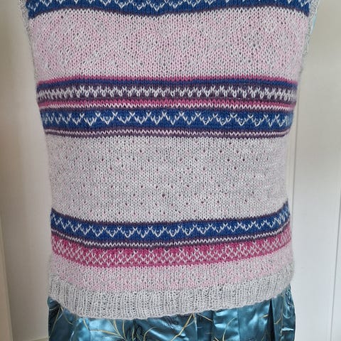 Dette er en nystrikket vest i garnet Air som er en ganske ny garntype. Garnet er blandet av baby alpaca og merinoull. Garnet kalles air fordi det er spesielt lett og luftig, men godt og varmt.