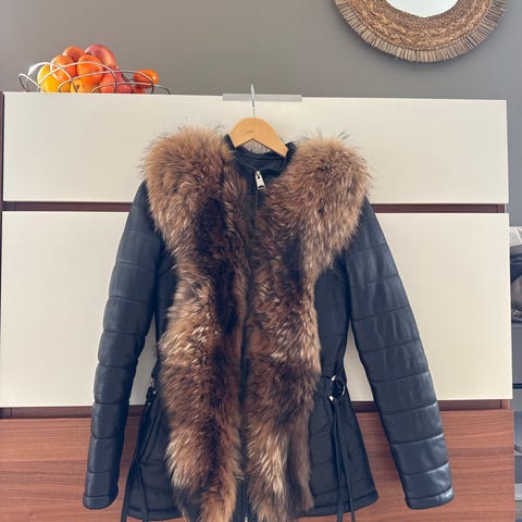 Pent brukt pelsjakke med hette. Ny pris var