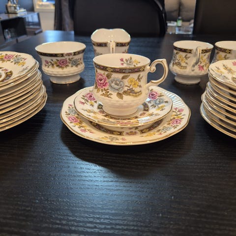 Selger ett gammelt servise som ikke blir brukt. Usikker hvor det er kjøpt. Det er 12 middagstallerkener, 12 dype tallerkner, 2 boller, 1 fat og sausnebb. Kun brukt ett par ganger. Noe er aldri brukt. Selger også 9 asjetter, 9 kaffekopper med skål der 3 kopper og skåler ikke har en gullkant. (Se bilder)