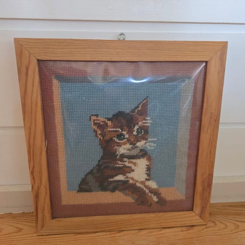 Håndbrodert bilde med bamsemotiv. Bildet er rammet inn hos Mesterrammer og har børstet gullramme og passepartout. Bildet måler 27 cm x 30 cm med ramme. Bildet har aldri vært i bruk, beskyttelsesplasten til rammen ble tatt av før fotografering. Bildet passer fint som nyfødt-, dåp- eller navnedagsgave. Bildet selges for kr 175,-