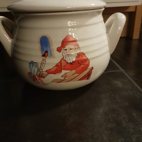 Koselig julegryte i keramikk som det er plass til telys under for å holde på varmen . Selges for 100 kr . Kan sendes for 130 kr med post nord eller posten til 135 kr eller fiks ferdig som er litt dyrere å sende med .