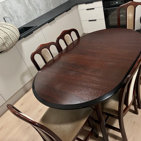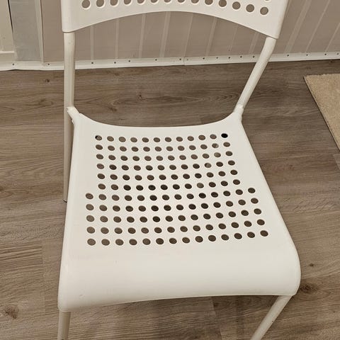 Leier ut bord med stoler. 4 bord (180 x 76 x 74 cm) og 17 stoler (mangler 1 ...). Da disse nå begynner å bli litt brukt så anbefales det å ha på en form for duk (er litt hakker i bordplatene)