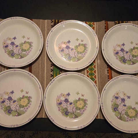 Et sommerlig og flott sett til dessert, bestående av 6 skåler og en bolle. Alt er i veldig god stand. Settet er dekorert med blåbærlyng og er designet av Marguerite Walfridsson for IKEA på 70-tallet. Settet er nummerert.