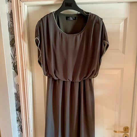 Grågrønn/olivengrønn kjole fra Zay. Sølv rundt hals og ermhuler. Ubrukt. 54/56. Kan sendes på kjøpers regning.