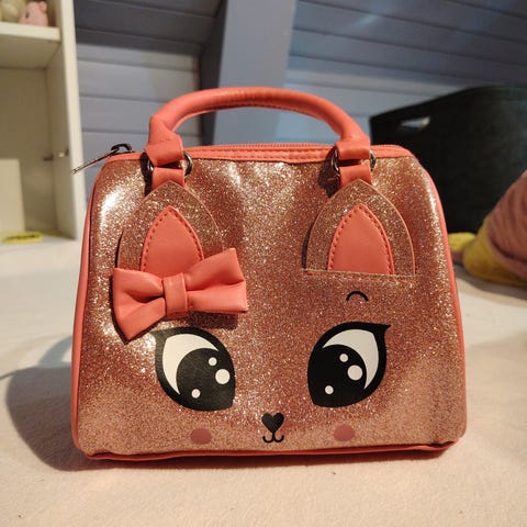 Fin veske med motiv av rev. Gull. rosa og svart med glidelåslukking. Ca 17 cm i diameter. Vesken er pent brukt 2 ganger.