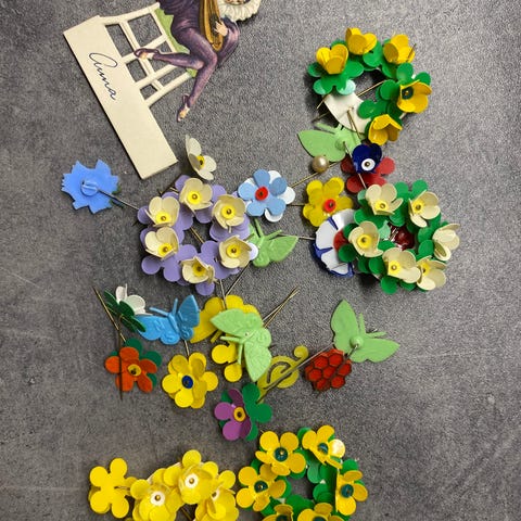 Rosepins i ulike farger selges. Hvit, gul, orange, lys blå, rød og rosa.
