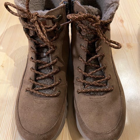 Vannavstøtende støvel med snøring og overdel i semsket skinn, med fuskepelskant, strassdetaljer og avtagbar Arch Fit dempende innersåle.