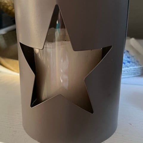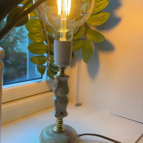 Pent brukt, lyser som den skal. Den er i hvit metall. Retro, men også tidløs