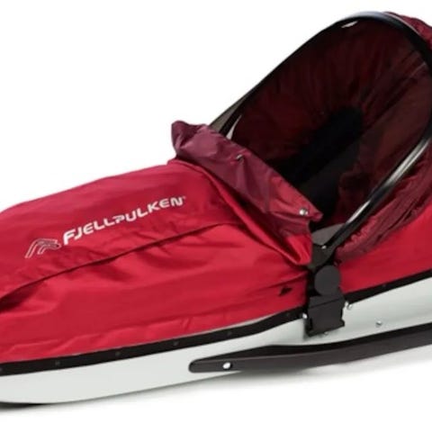 Leier ut fjellpulken for barn. Med stag, sele, vindtrekk og skjerm.