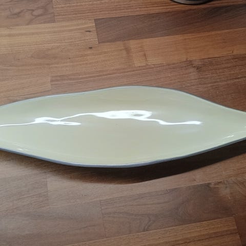 DEKORATIVT BRØDFAT FRA STAVANGER FLINT. "NOEN HAR BRØD MEN KAN IKKE SPISE. ANDRE KAN SPISE, MEN HAR IKKE BRØD. VI HAR BRØD OG VI KAN SPISE DERFOR VIL VI HERREN PRISE. " FATET ER BLANKT OG FINT I DEKOR OG GULL MEN HAR LITT KRAKELERING. MERKE PÅ BAKSIDEN ETTER OPPHENG. FATET MÅLER 25X25 CM.