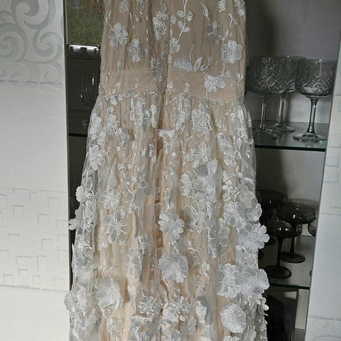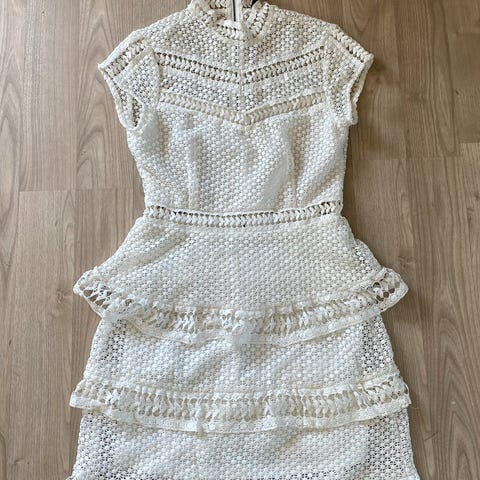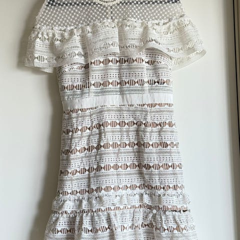 Nydelig hvit blondekjole selges billig. Kjolen er nytt og aldri brukt, kun stått til pynt. Har ikke lappen, men husker at jeg har betalt litt over 1100 kr for kjolen.
