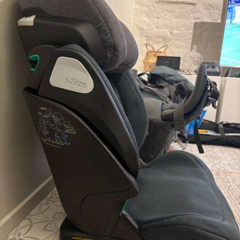 Festes med Easy Fix. Setet har håndtak til å løfte av basen. Og regulerbar sitte/liggestilling. Regulerbare seler etterhvert som barnet blir større.