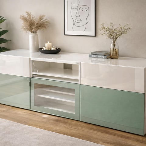 Den robuste konstruksjonen til dette HiFi-skapet gjør det svært holdbart. Det er god plass igjen for å holde DVD-spilleren, spillkonsollen, streaming-enheten og mediebærerne pent organisert. Denne TV-benken har RGB LED-lys, som har forskjellige menyer for å endre fargen på lysene og la fargen justeres automatisk annerledes. LED-lysene understreker det moderne utseendet og bidrar til den trendy følelsen. I tillegg er denne TV-enheten enkel å rengjøre med en fuktig klut.