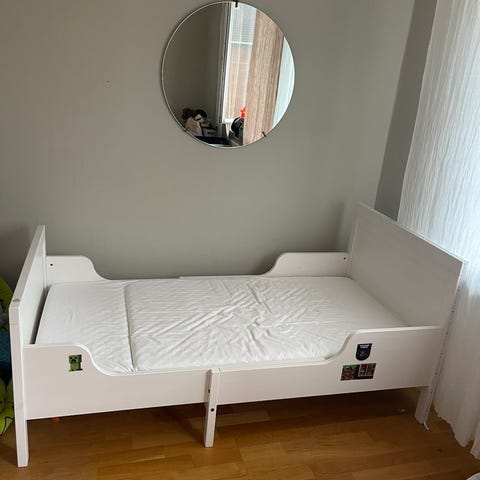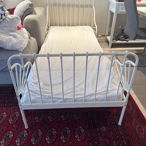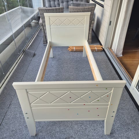 Lenge brukt barneseng med stort potensiale. Et strøk maling vil gjøre den så god som ny. Pent og tidløst design. Hel plate i bunn og plass til de laveste eskene til Ikea under sengen. Enkel å montere og frakte.