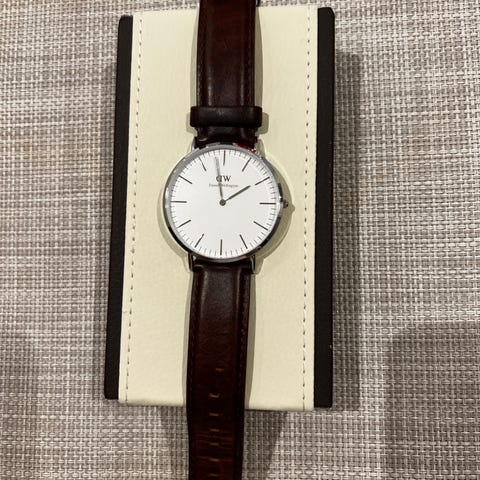 Pent og lite brukt Daniel Wellington armbåndsur med 2 utbyttbare skinnreimer i brunt og svart.