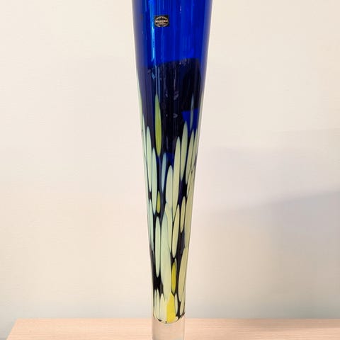 Vasen er ca 31 cm høy og har tykk glassbunn. Den er håndlaget i Krosno i Polen.