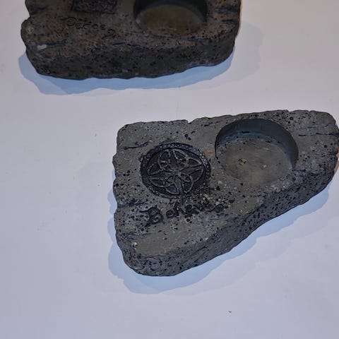 Sett med vase og to telysholdere. Svarte sideflater og sølvfargede toppflater. Noen små riper og merker i overflata. Telys er inkludert.