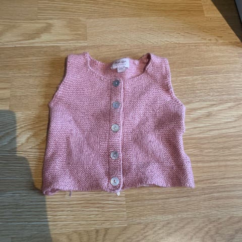 Hjemmestrikket Sarah-topp selges, oppskrift fra Klompelompe. Strikket i baby merinoull, i fargen lys rosa. Dekorative volanger på ermene, og det er hvite knapper i nakken. Str 18 mnd. Helt ny og ubrukt.