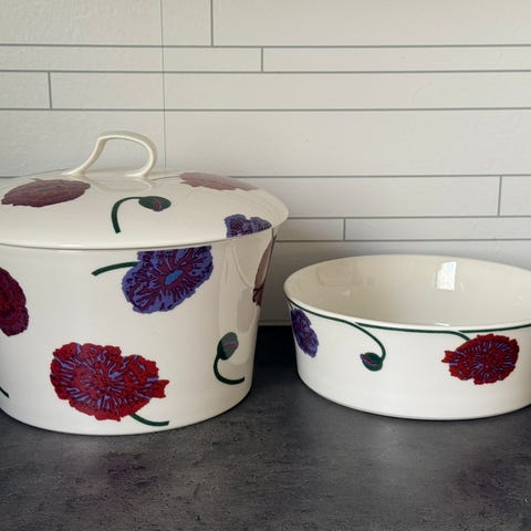 Sommer kaffe sett 4 nye skåler, te/kaffe krukke. Kan sende I post. Pris krukke/skåler for seg.