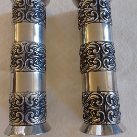 Selger et par koselige lysestaker i tinn til å henge opp på veggen. De er fra 1960-1970-tallet og har noen bruksmerker. Dette fremkommer på bildene og er ikke noe man legger merke til når de henger oppe.